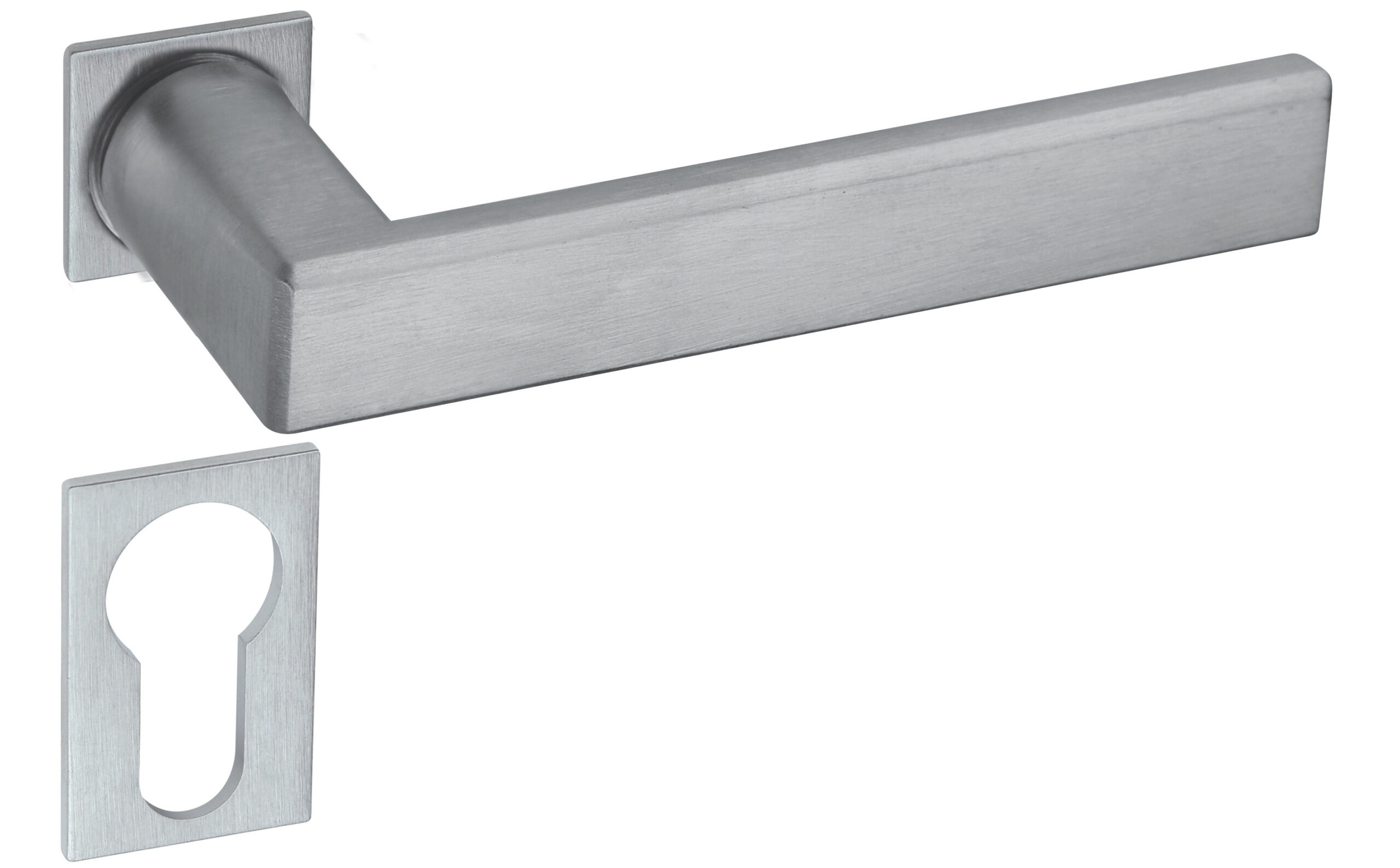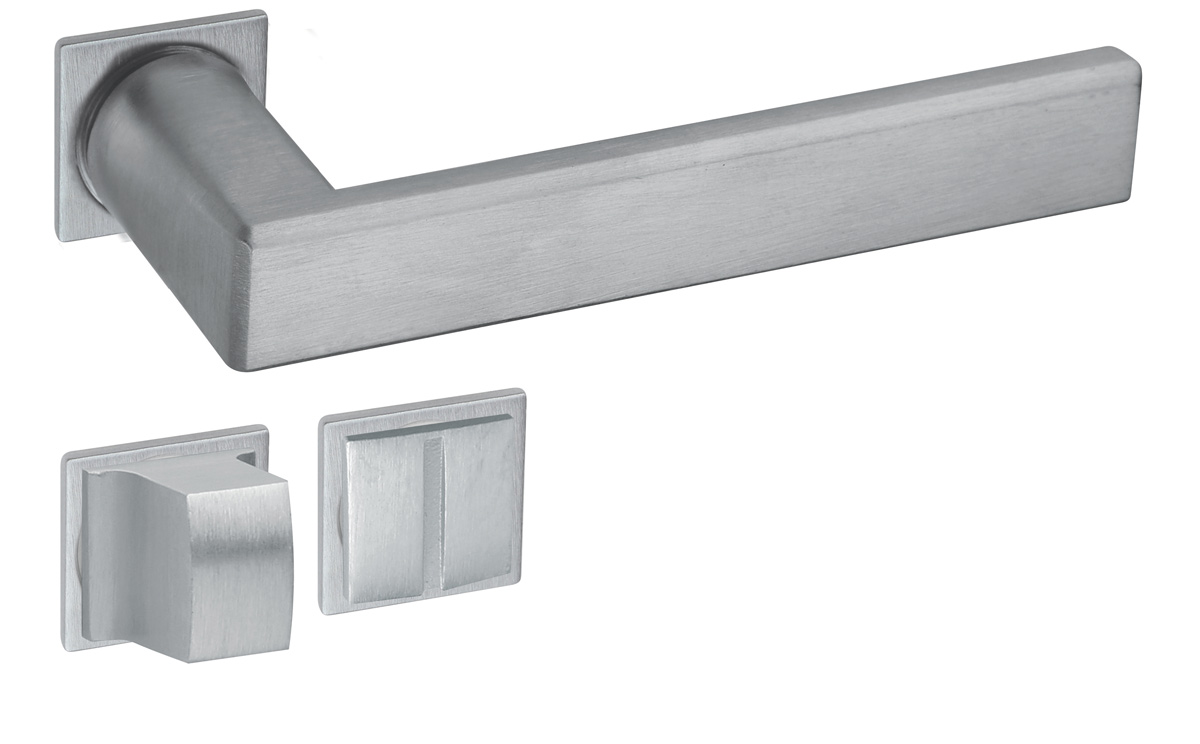 Maniglia su rosetta quadra con bocchetta foro chiave, Maniglia su rosetta quadra con bocchetta foro cilindro, Maniglia su rosetta quadra con nottolino square libero/occupato |